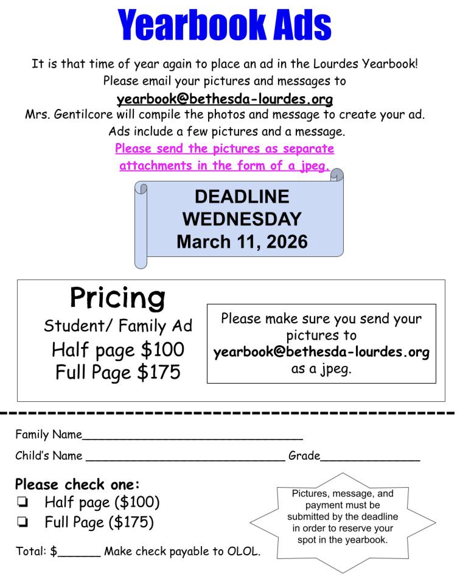 Email your pictures and messages to yearbook@bethesda-lourdes.org. Mrs. Gentilcore will compile your content to create the ad. You can include a few pictures and a message. Send pictures as jpeg attachments.